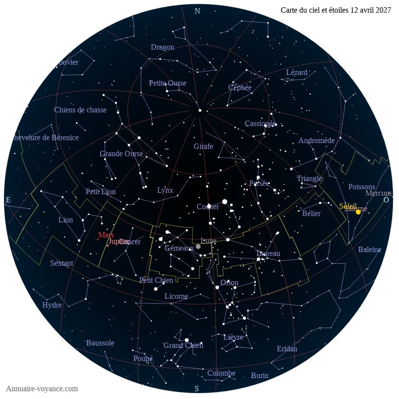 Carte du ciel et des étoiles du 12 avril 2027